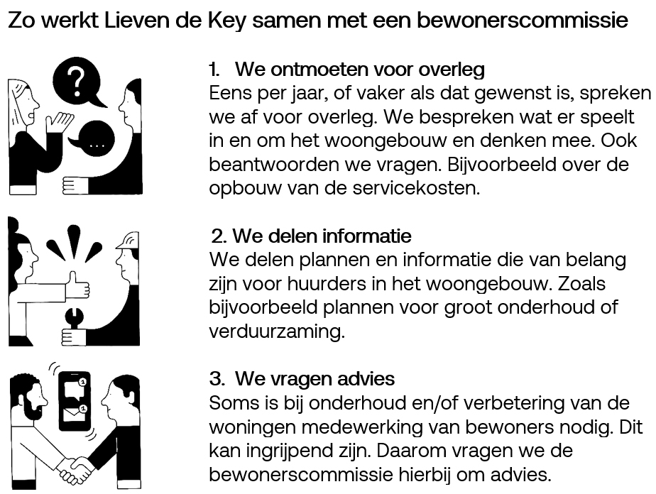 <p>Een bewonerscommissie bestaat uit betrokken huurders in een woongebouw. Lieven de Key overlegt met de bewonerscommissie over prettig wonen en deelt informatie die belangrijk is voor huurders. Voor plannen die ingrijpend kunnen zijn voor bewoners vraagt Lieven de Key de bewonerscommissie om advies.<br />