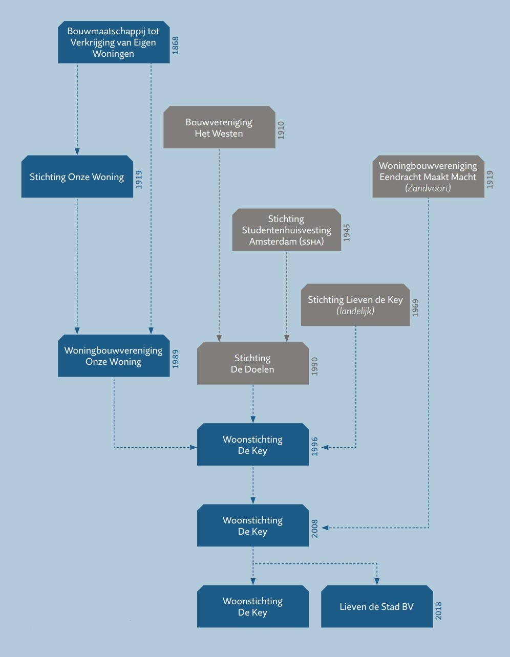 <p>De stamboom van Woonstichting Lieven de Key en haar voorgangers zoals te vinden in "Het begon met Dubbeltjes..."<br />
