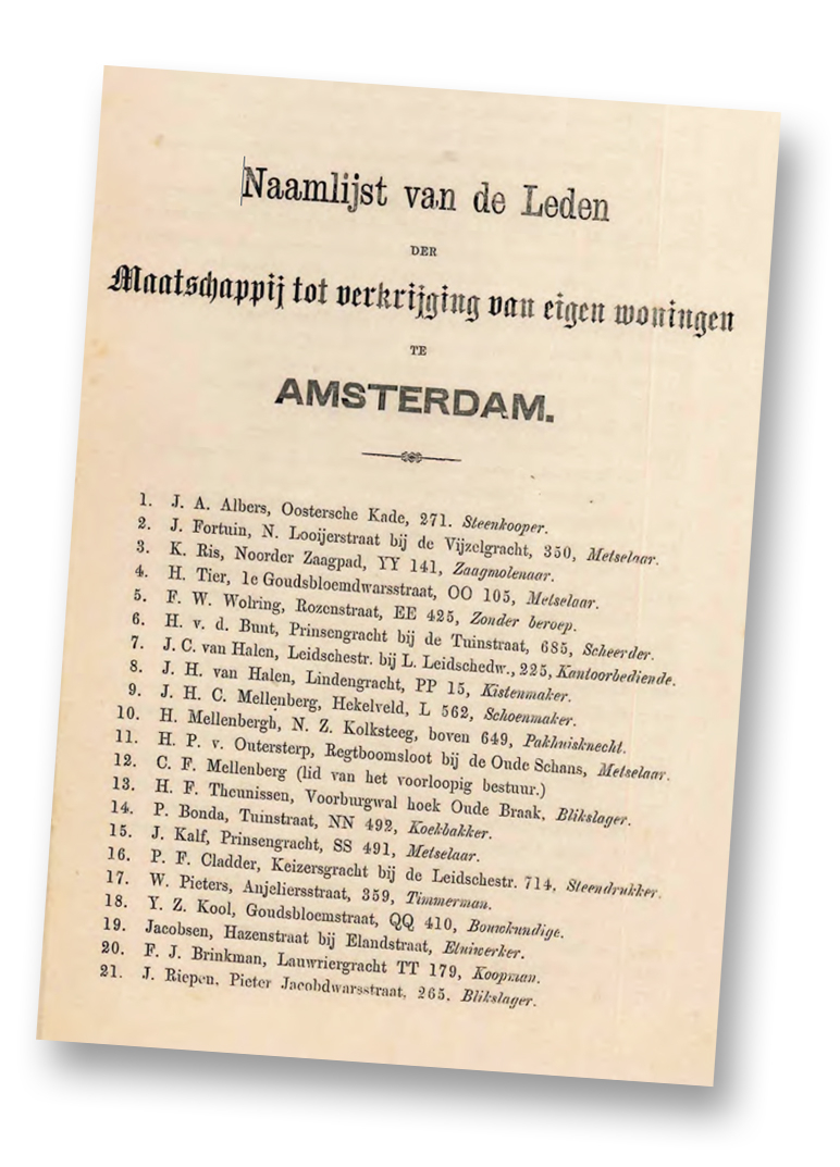 <p>Deze arbeiders waren de eerste leden van de Bouwmaatschappij tot Verkrijging van Eigen Woningen en spaarden wekelijks een dubbeltje voor een woning. (<a client-url="Media/212d9531-9945-4f4d-a726-c639d806cb73/original/1868-ledenlijst.pdf/" data-last-type="media" href="Media/212d9531-9945-4f4d-a726-c639d806cb73/original/1868-ledenlijst.pdf/" ng-link="" target="_blank" tokenbased="false">PDF download: 2,62 mb</a>)</p>